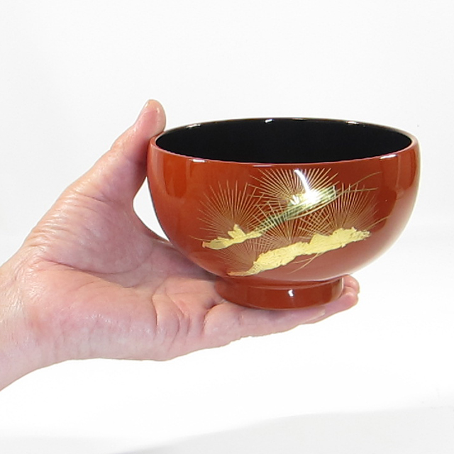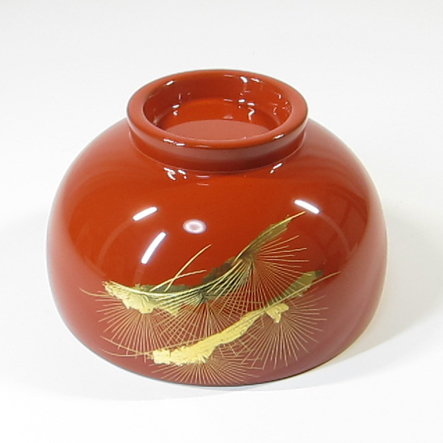 輪島塗 汁椀 【手彫り沈金 寿松】-オレンジ朱-【桐箱入り】